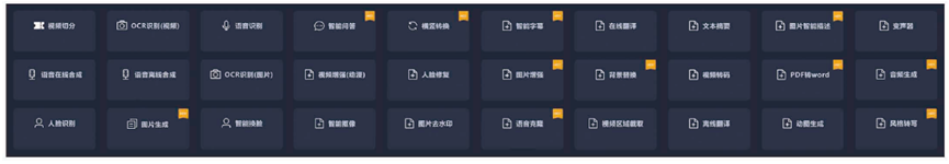 视频智能工具集由处理类智能工具和生成式智能工具这两类组成,支持对音、视、图、文、虚拟素材进行智能处理,目前已支持:视频切分、视频OCR识别、语音识别、语音在线合成、语音离线合成、人脸识别、图片生成、智能换脸、智能问答、横竖转换、智能字幕、动漫视频增强、人脸修复、图片增强、智能抠像、图片去水印、语音克隆、在线翻译、文本摘要、图片智能描述、背景转换、视频转码、视频区域截取、动图生成、变声器、音频生成、人脸动画等,系统会依据实际需要而不断扩充、完善。