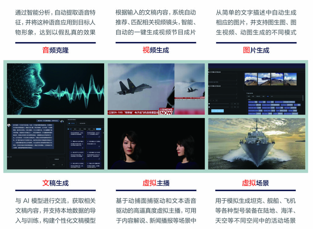音频方面,系统支持多种语言的语音合成,也支持用户指定特定人物进行语音训练,还支持文字生成音乐和音效;视频方面,系统支持视频文字稿自动撰写,根据视频文字稿结合媒资库数据智能推荐镜头实现“一键成片”,并支持用户“深度精排”,灵活替换其中的任一镜头;图片方面,系统支持根据文字内容生成静态图片、静态片生成动态图片、以图片生成图片、以图片生成镜头等多种图片生成方式;文本方面,系统支持多种开源大模型的集成部署和自由灵活切换,支持大模型的管理和微调训练,支持基于大模型的知识库问答,以及多种公文辅助写作;虚拟方面,系统支持虚拟主播的语音合成与口型对齐,也支持不同虚拟主播和在不同虚拟场景下的快速合成与替换。系统支持国产化软硬件环境,支持离线局域网部署,可以应用在党政军企日常教学培训、宣传制作、信息整编以及业务办公等活动中,用于各类素材生成、视频快速制作、视频批量生产以及内容讲评播报等业务,提升效率,降低成本。